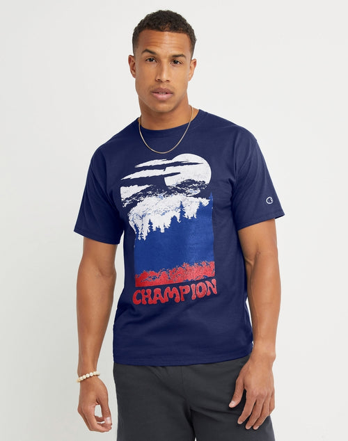 A true camper's delight, this men's cotton t-shirt was made with the outdoorsy folks in mind. A standard fit cotton tee that has been ring-spun for softness and that worn-in feel you love. A classic forest with the setting sun and peaking mountains graphic take over this t-shirt for a look that's as cool as it is comfortable. The Champion script sits under the graphic in a vintage-inspired font for added style, while the iconic C logo sits on the left sleeve of this graphic tee, giving that authentic Champion vibe.