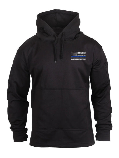 Rothco Thin Blue Line Concealed Carry Hoodie is made of comfortable 100% polyester performance material and features a large pass-through kangaroo pocket with an access point beneath for optimal concealed carry.