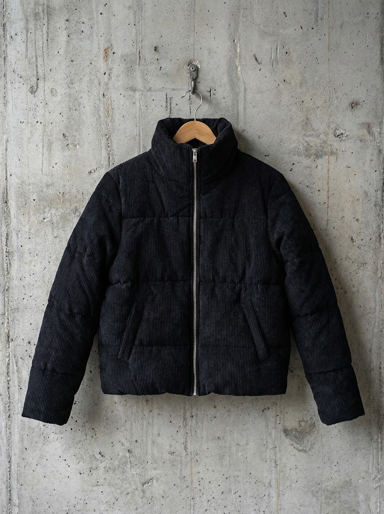 - A quilted puffer jacket in a corduroy fabrication featuring a high collar