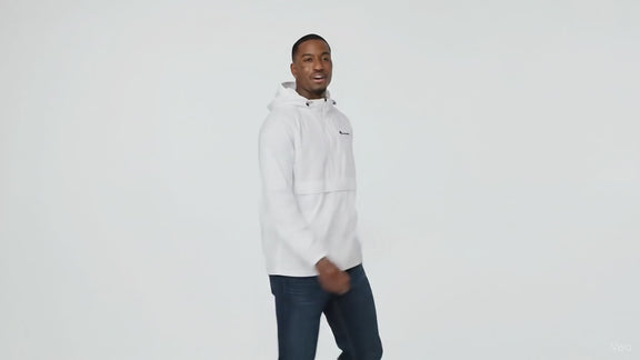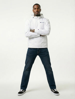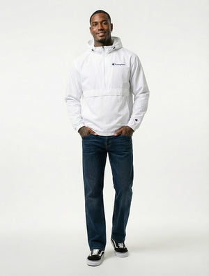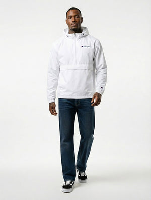 The Champion Packable Jacket is a lightweight, versatile outer layer designed for everyday wear. This clean White edition features a durable water-resistant shell, adjustable hood, and a half-zip front for easy layering. The jacket conveniently folds into its own front pocket, making it perfect for travel, commuting, or unpredictable weather.