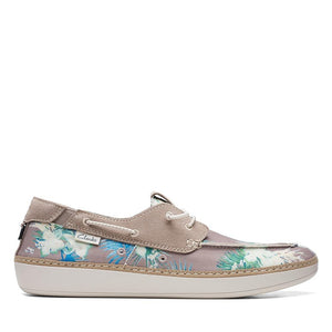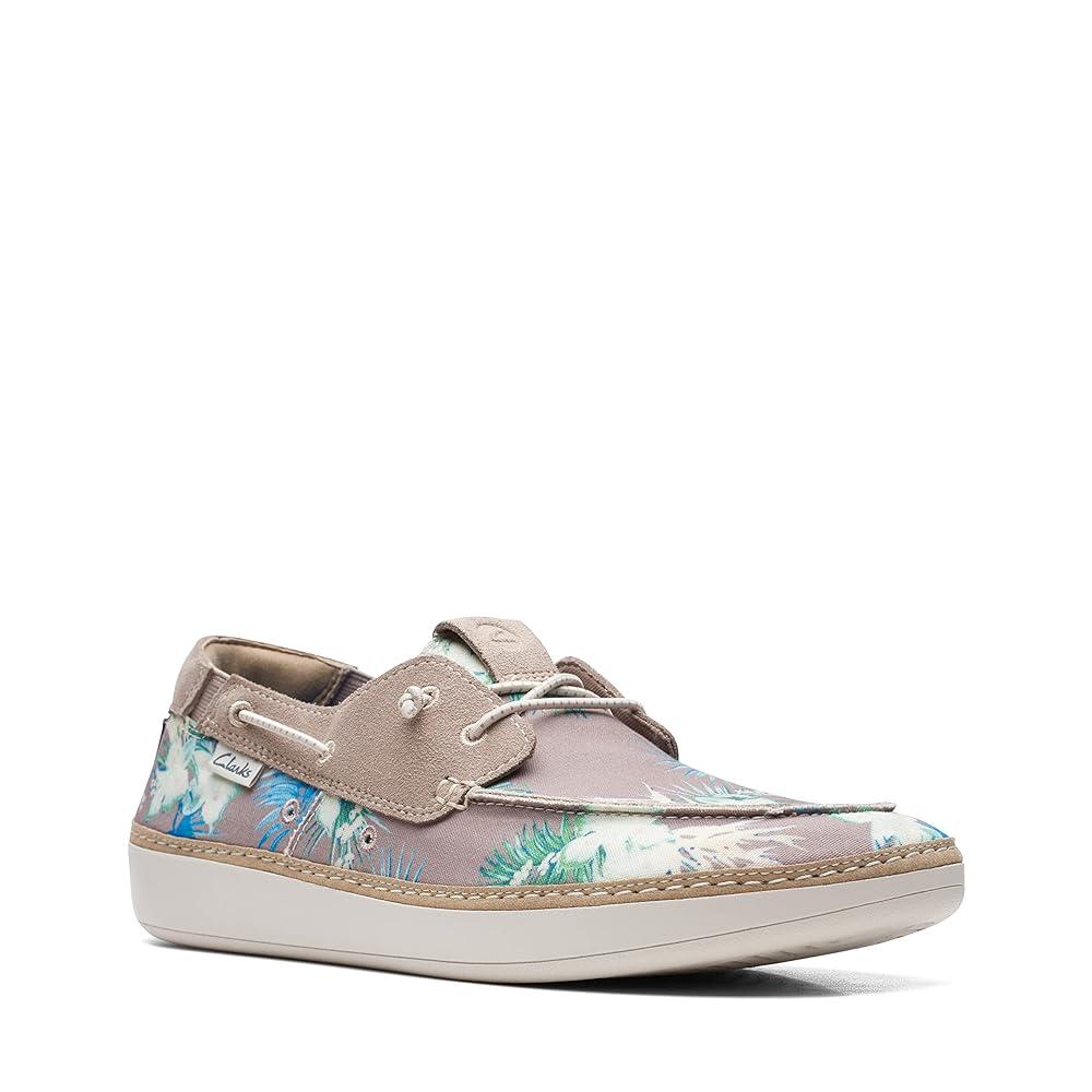 Bring vacation vibes to your everyday style with the Clarks Higley Tie Boat Shoes in Sand Floral. Designed for the modern adventurer, this slip-on sneaker-meets-boat shoe hybrid features a breathable canvas upper covered in a bold tropical floral print that sets it apart. Rawhide laces, moc-toe stitching, and sidewall eyelets offer a classic nautical look, while a soft interior lining and cushioned insole keep your feet comfortable all day long. Whether you're heading to the coast, cruising around town, or just soaking in the sun, this laid-back style adds instant personality to any outfit.