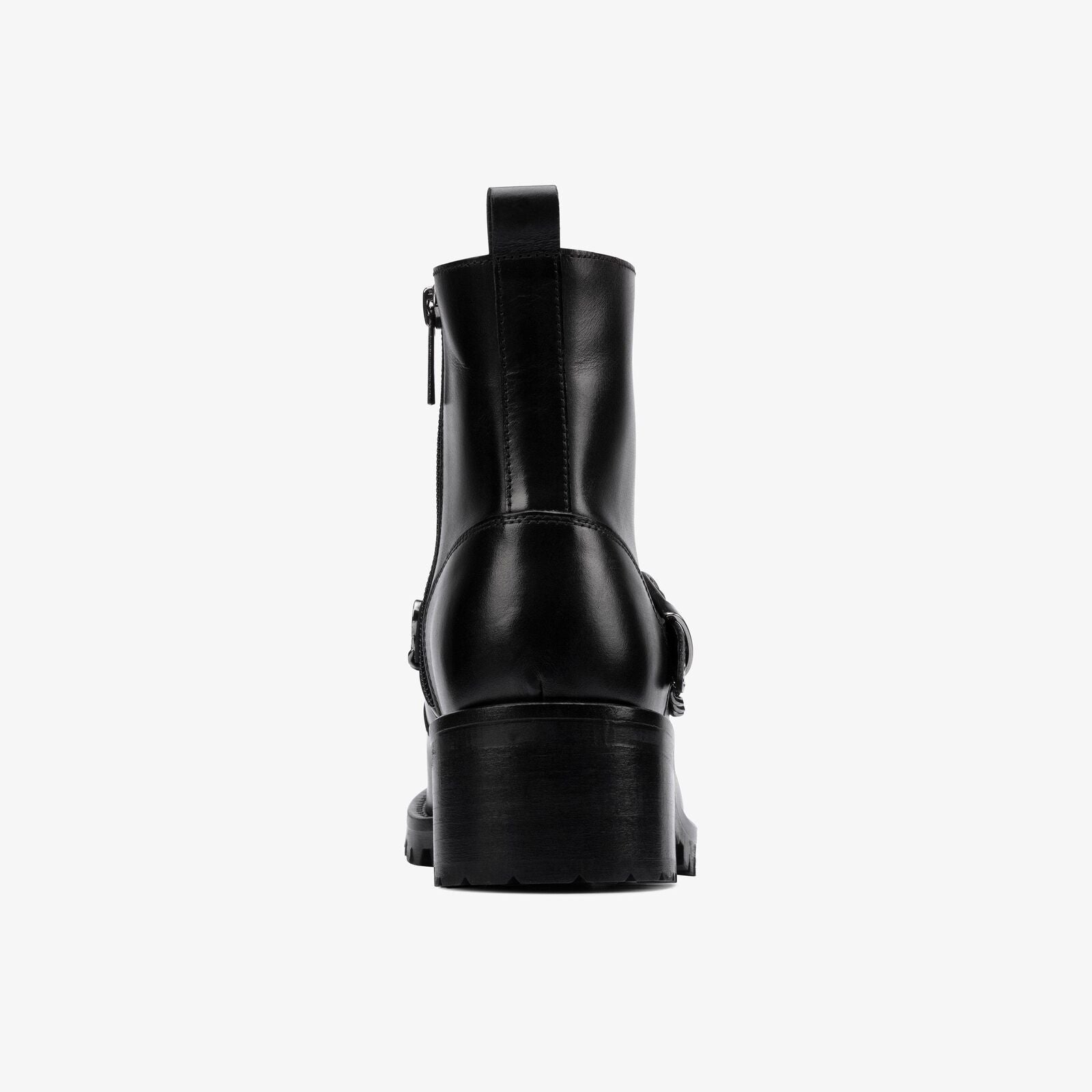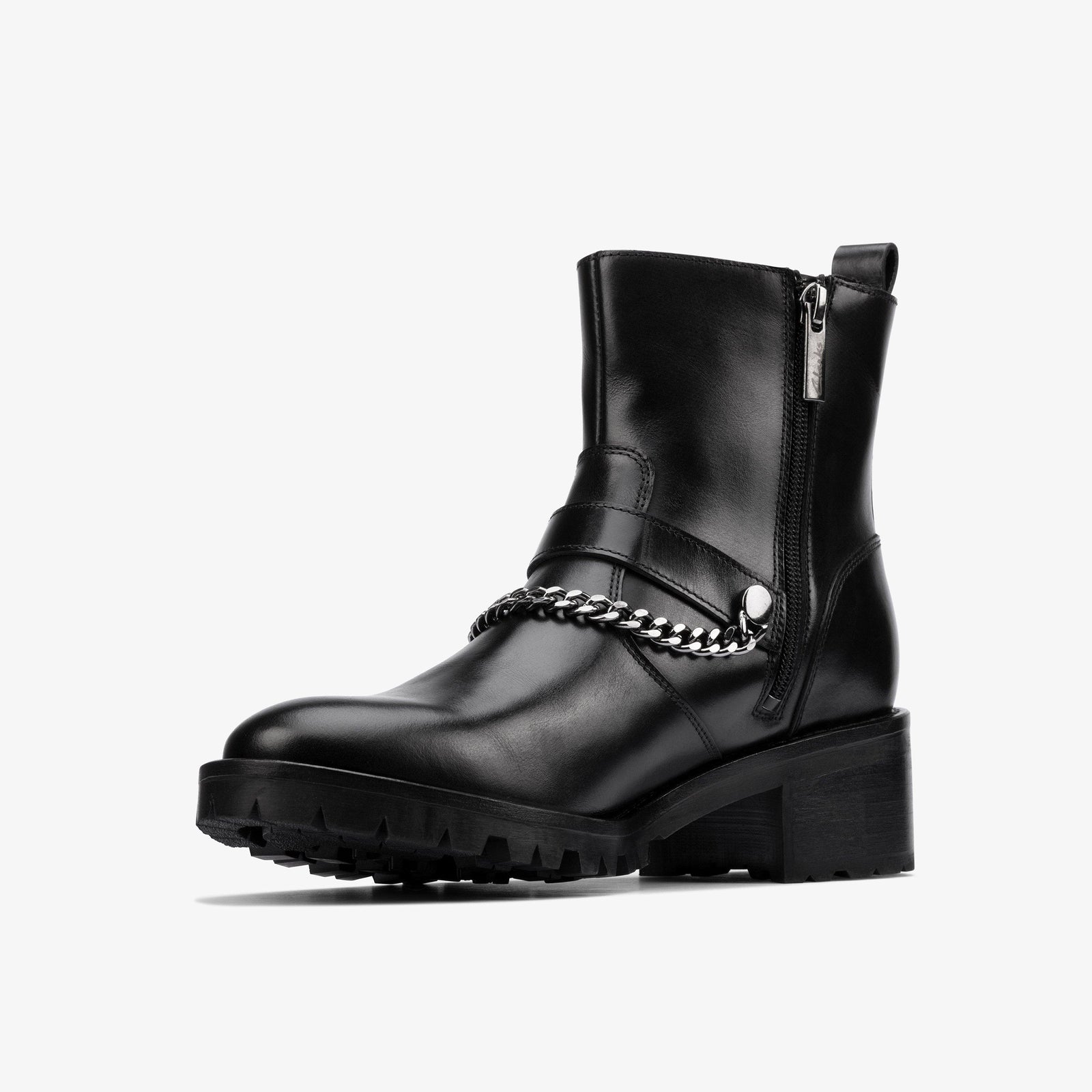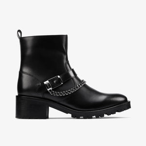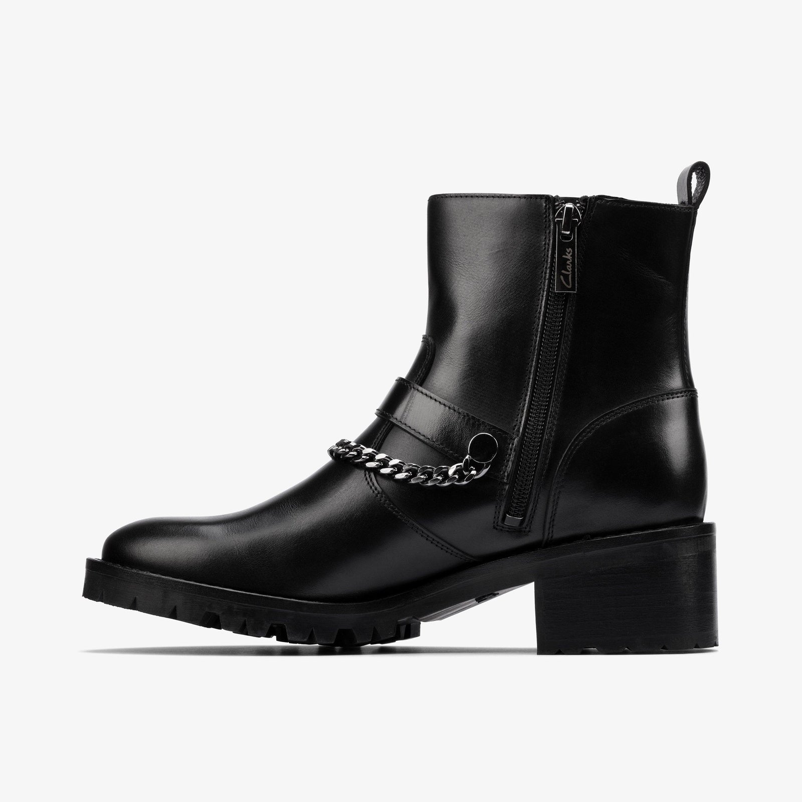 Refined yet bold, the Clarks Roseleigh‑High Boot delivers everyday elegance with an edge. Crafted from soft black leather and detailed with chic chain and buckle accents, this mid-height boot blends modern sophistication with comfort-focused design—perfect for the woman on the move.