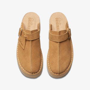 Joining the family, our new summer icon Trek Wedge Mule melds premium materials with contemporary design details. Crafted in soft mid tan suede for ultra-versatile wear, pebble crepe soles balance each pair perfectly – while metal buckles lend a statement touch.
