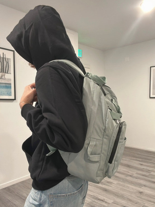 Front zip organizer pocket and side bottle holder for outdoor-ready utility