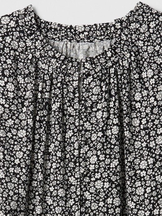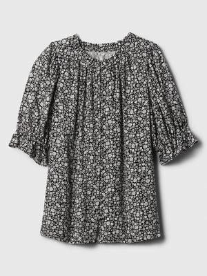 Smooth poplin weave. Elbow-length puff sleeves with elasticized ruffle cuffs. Ruffle trim and shirring at split neckline