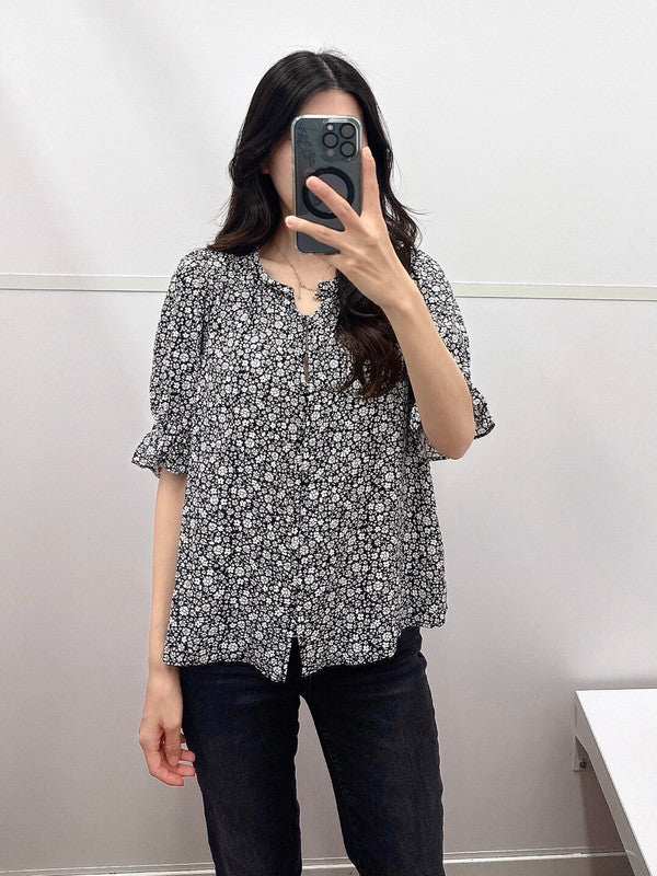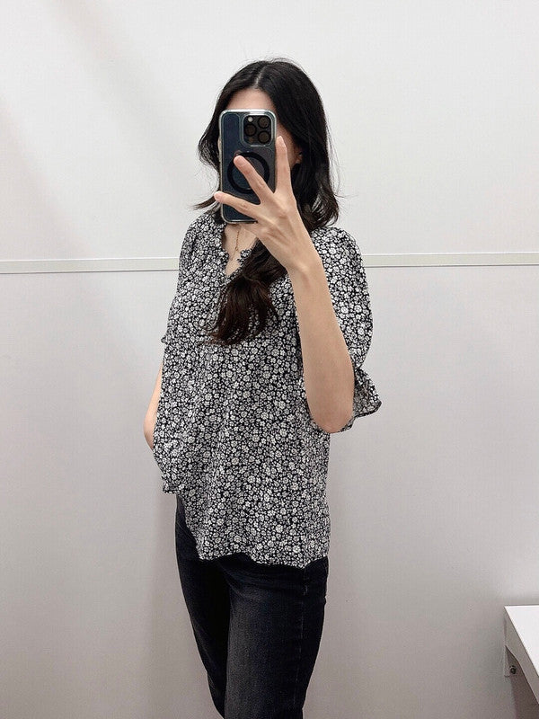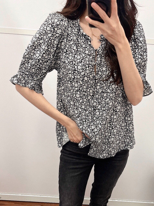 Gap Women's Floral Print Puff Sleeve Ruffle Top White Black Floral 405572 00 G1