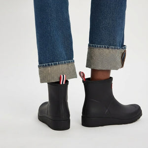 The Hunter Play Short Rain Boot in Black combines classic Hunter waterproof protection with a modern, lightweight silhouette. Built from natural rubber and designed with a clean platform-style sole, it offers easy comfort, everyday versatility, and a sleek minimalist look that works with any rainy-day outfit.