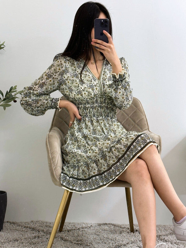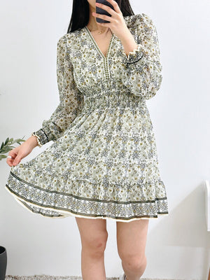 A smocked waist shapes the silhouette of this floral-patterned dress framed by long sleeves.
