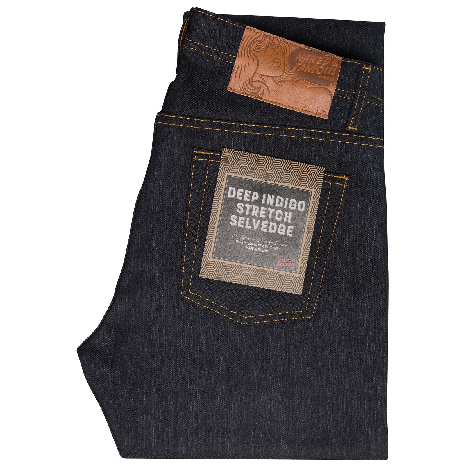 - The Deep Indigo Stretch Selvedge is a 12oz indigo rope dyed Japanese selvedge denim