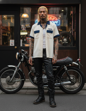 Designed with a boxy silhouette and contrast graphic embroidery across the chest and back, the Diablo is a bold yet refined piece built for the open road, warm nights, and coastal hangs. Finished with a classic straight hem and a relaxed button-down look.
