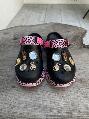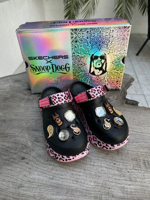 Step into the spotlight with the Skechers x Snoop Dogg Foamies Max Cushioning – Purrfect. This eye-catching sneaker clog combines bold design with unparalleled comfort. Featuring a sculpted Foamies® EVA upper, detachable back strap, and a striking leopard print midsole, it's adorned with exclusive Snoop-themed removable vamp charms. The durable dual-density traction outsole ensures stability across various surfaces, while the 2-inch heel adds a subtle lift. Perfect for those who want to make a statement without compromising on comfort.