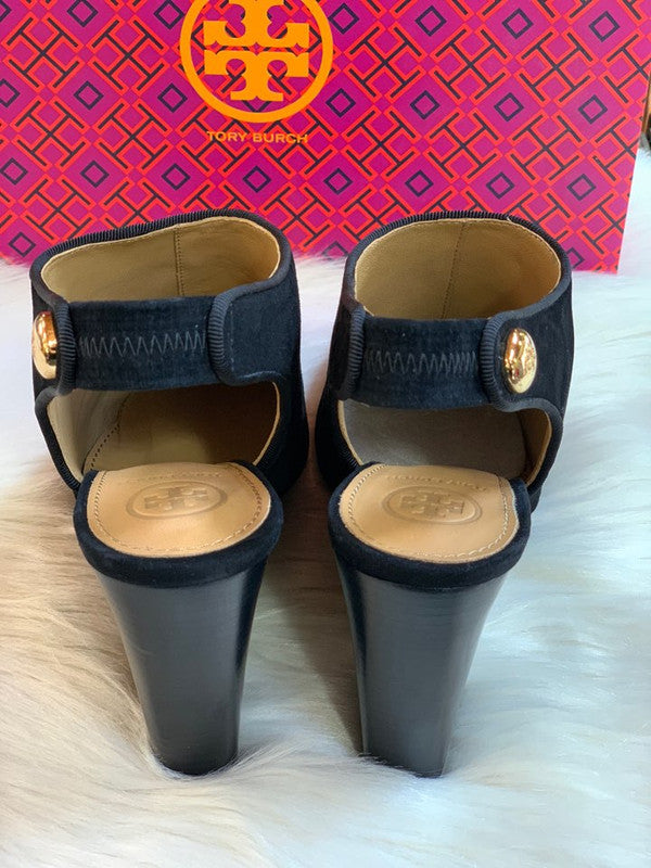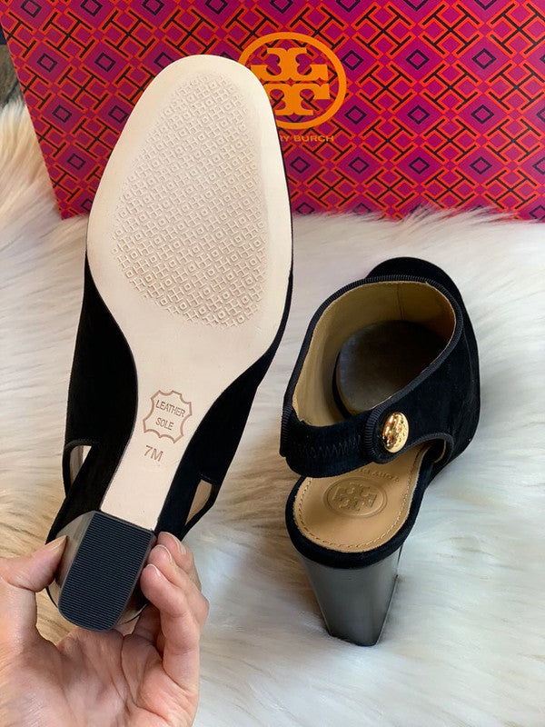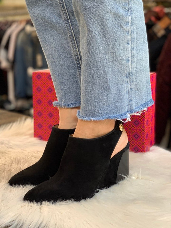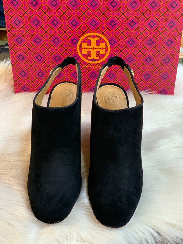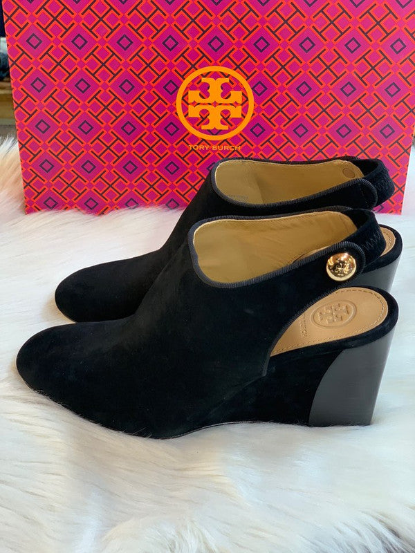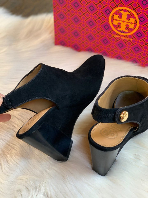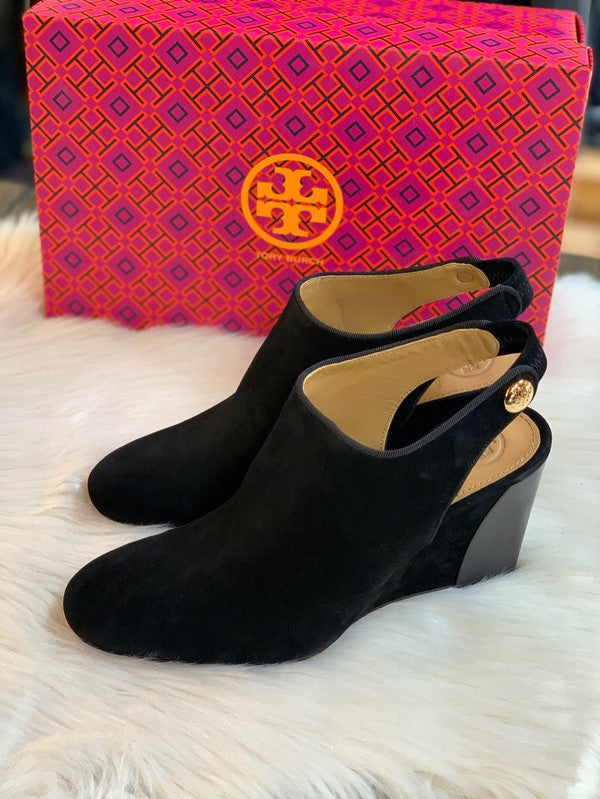 Tory Burch Women's Marisa 85MM Open Back Wedge Bootie Kid Suede Perfect Black 50839 006