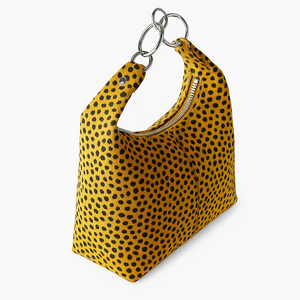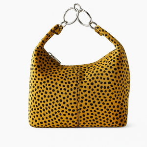 Soft leather bag covered in printed calf hair for a wonderful textured design. With a lined interior and zip pocket, complete with a zip closure and short shoulder strap accented in metal chain.