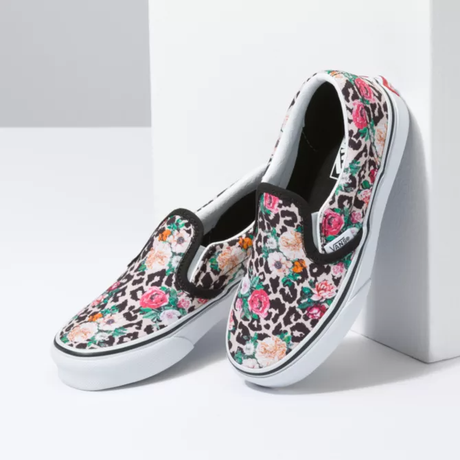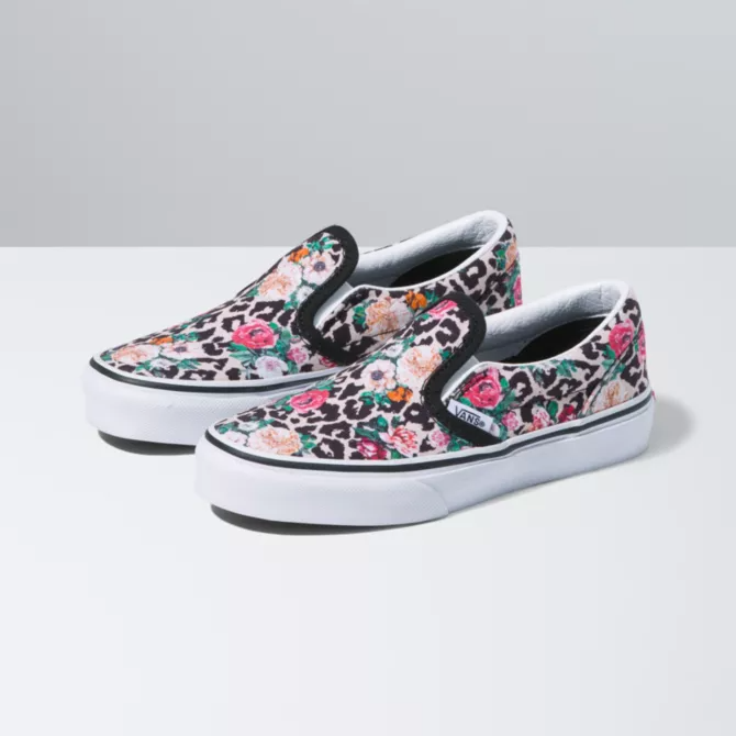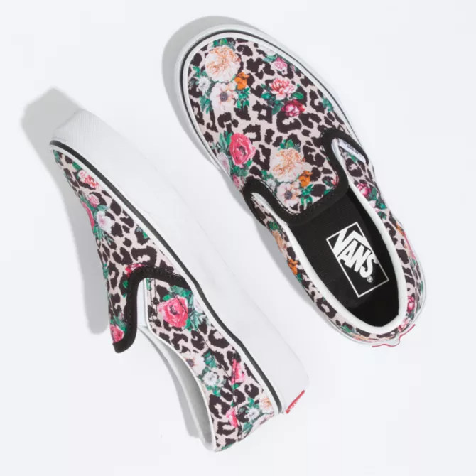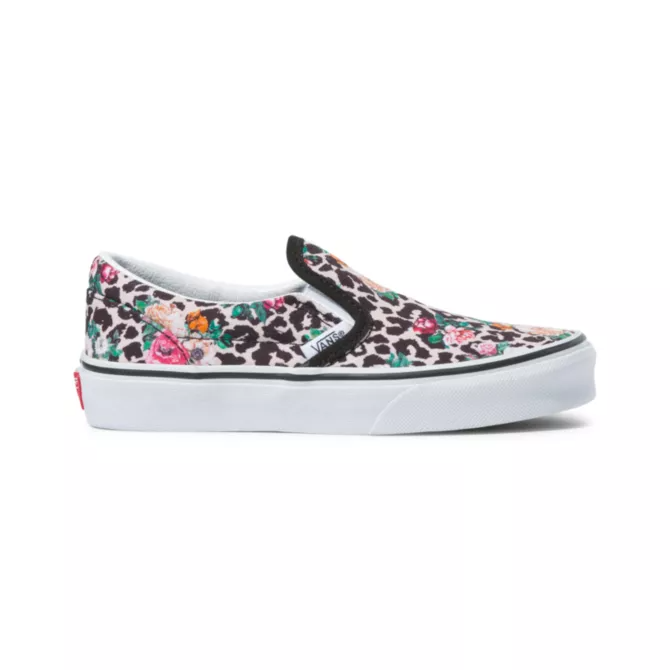 First introduced in 1977, the Vans #98-now known as the Classic Slip-On-instantly became an icon in Southern California. Fast forward to today, and the Classic Slip-On is known worldwide for its comfortable silhouette, easy wearability, and beloved design. Featuring mixed floral and leopard prints, the Leopard Floral Kids Classic Slip-On is an everyday essential with true ??Off The Wall" style. This iconic slip-on shoe also includes low profile textile uppers, supportive padded collars, elastic side accents, and signature rubber waffle outsoles.