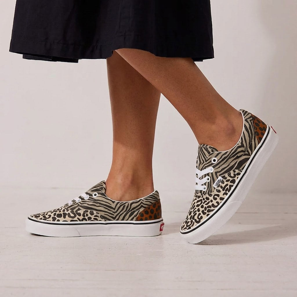 The Vans Safari Multi Era brings a playful twist to the classic Era silhouette with a mix of safari-inspired patterns and soft neutral tones. The Sandshell/True White colorway blends animal-print accents with clean canvas panels for a bold yet wearable look. With padded collars, durable construction, and Vans’ iconic waffle outsole, the Era remains a staple for everyday comfort and style.
