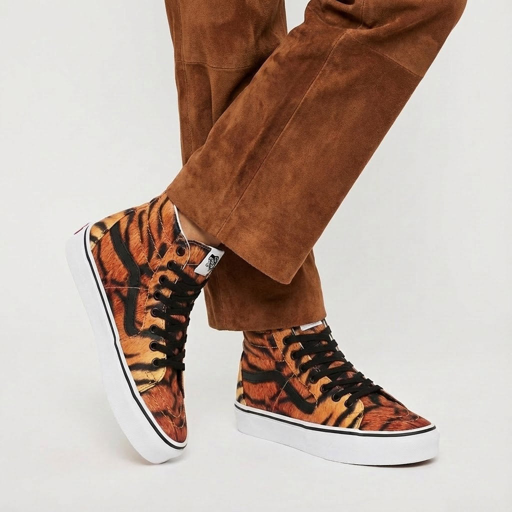 The Vans UA Sk8-Hi Tapered brings a slimmer, more refined take on the iconic Sk8-Hi silhouette. This Tiger/True White edition features bold animal-inspired patterning paired with a clean white sole for a standout look. Lightweight, flexible, and stylish, the Tapered design offers a sleeker profile without sacrificing the classic Vans aesthetic.