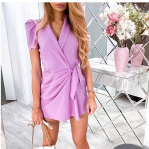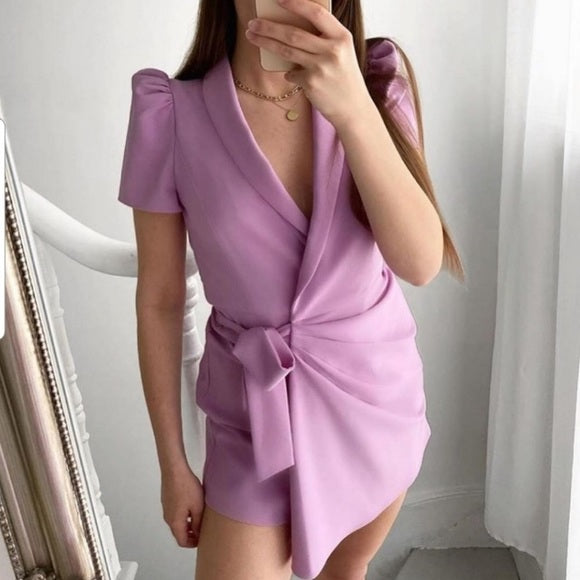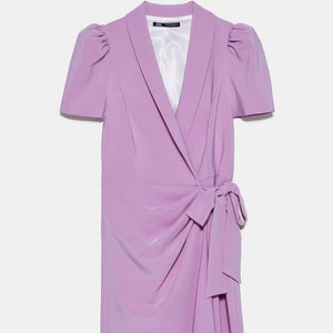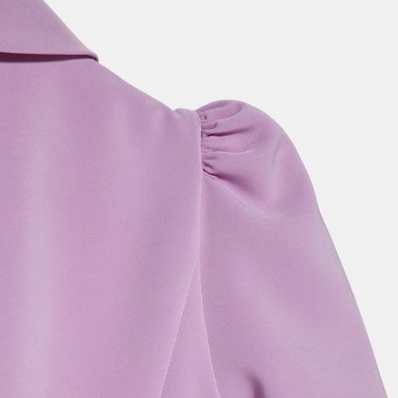 So stylish and pretty at same time.... beautiful lilac color... love lapel collar with short puff sleeves.... stretchy material with elastane for comfort